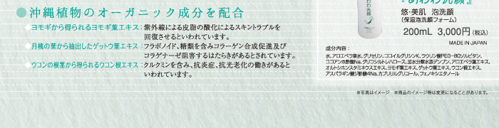 肌に優しい天然ヤシ油脂肪酸と人肌コラーゲンのアミノ酸の一種であるグリシリン、沖縄植物成分のヨモギエキス、月桃エキス、ウコンエキスを配合。いきいきとしたお肌へと導きます。